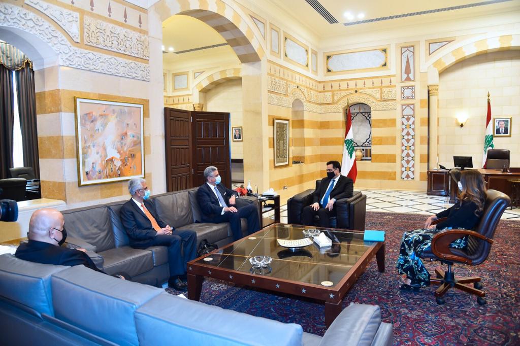 Caretaker Prime Minister, Hassan Diab received at the Grand Serail, World Bank Vice President for the Middle East and North Africa, Farid Belhaj, Executive Director and Chairman of the Board of Executive Directors, and Lebanon's Representative on the World Bank Board of Directors, Dr. Mirza Hassan, and Regional Director of the Mashreq Department at the World Bank, Saroj Kumar Jha, in the presence of Minister Zeina Akar.