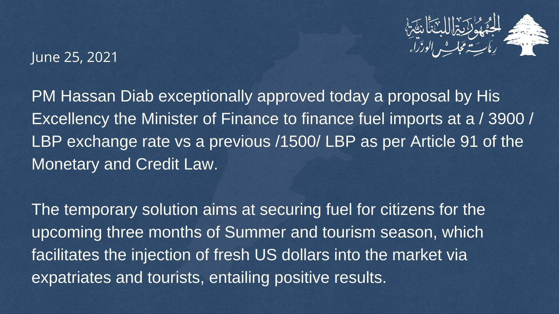 PM Hassan Diab exceptionally approved today a proposal by His Excellency the Minister of Finance to finance fuel imports at a / 3900 / LBP exchange...
